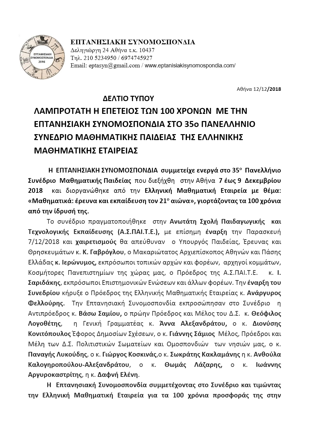 ΛΑΜΠΡΟΤΑΤΗ Η ΕΠΕΤΕΙΟΣ ΤΩΝ 100 ΧΡΟΝΩΝ ΜΕ ΤHΝ ΕΠΤΑΝΗΣΙΑΚΗ ΣΥΝΟΜΟΣΠΟΝΔΙΑ ΣΤΟ 35o ΠΑΝΕΛΛΗΝΙΟ ΣΥΝΕΔΡΙΟ ΜΑΘΗΜΑΤΙΚΗΣ ΠΑΙΔΕΙΑΣ ΤΗΣ ΕΛΛΗΝΙΚΗΣ ΜΑΘΗΜΑΤΙΚΗΣ ΕΤΑΙΡΕΙΑΣ Κοινοποιήστε: Μοιραστείτε στο X(Ανοίγει σε νέο παράθυρο) Χ Mοιραστείτε στο Facebook(Ανοίγει σε νέο παράθυρο) Facebook Εκτύπωση(Ανοίγει σε νέο παράθυρο) Εκτύπωση Στείλε ένα σύνδεσμο σε έναν φίλο(Ανοίγει σε νέο παράθυρο) Email Μου αρέσει! Φόρτωση... Δημοσιεύθηκε από SthKa Δείτε όλα τα άρθρα του/της SthKa