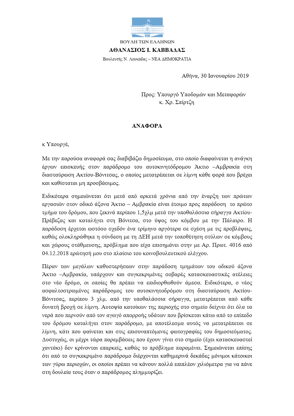Κατασκευαστικές ατέλειες στη διασταύρωση Ακτίου – Βόνιτσα του δρόμου Άκτιο –Αμβρακία καταγγέλλει ο βουλευτής Λευκάδας Θανάσης Καββαδάς στον υπουργό Υποδομών