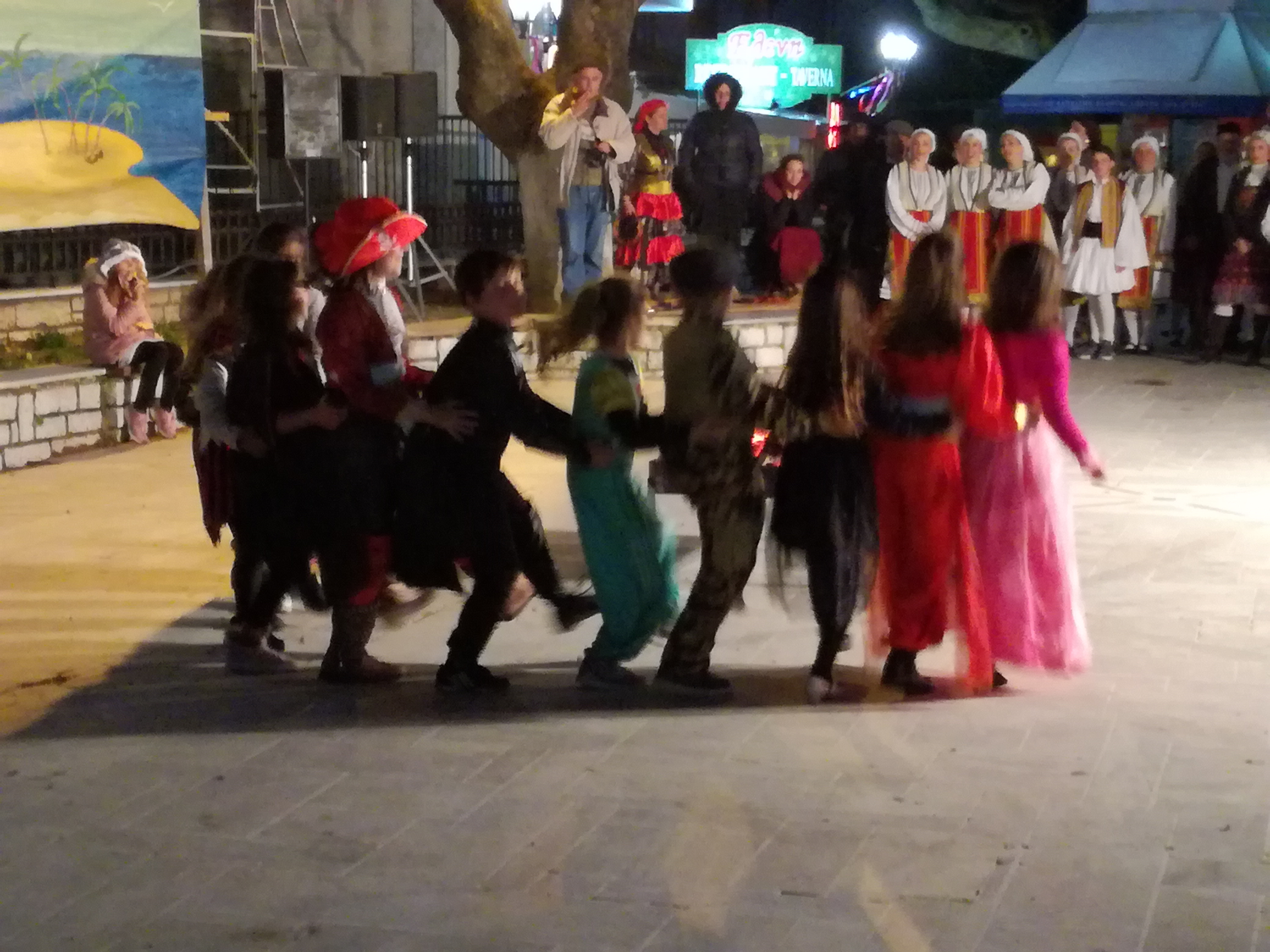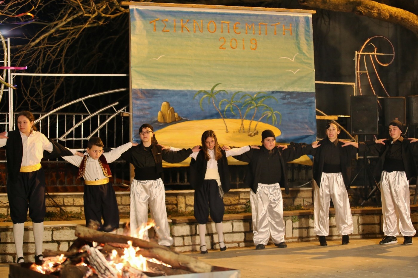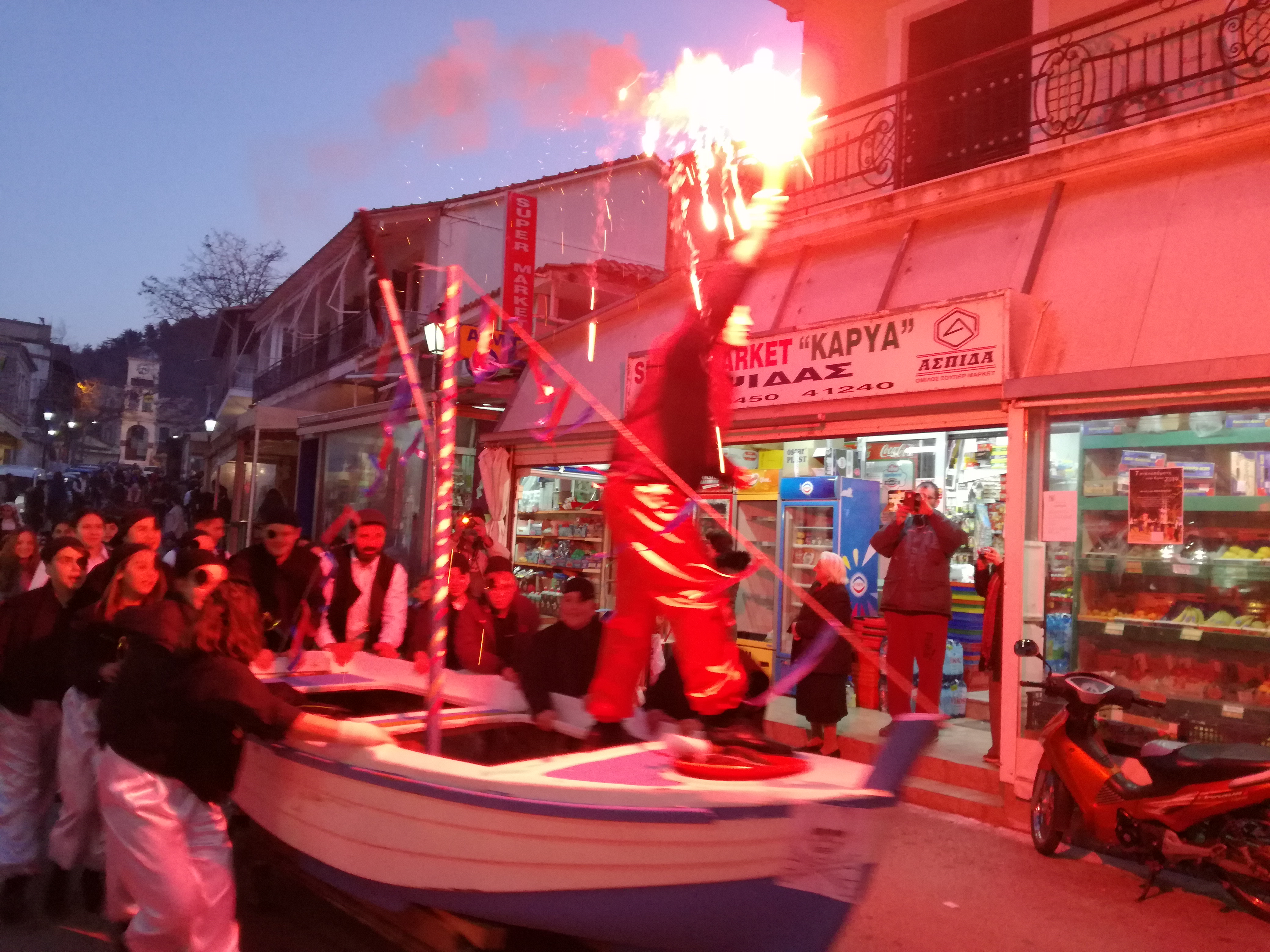Μόλις έπεσε το σκοτάδι ανάψαν φωτιές στην πλατεία και πίσω από τον καμπαναριό του Αγίου Σπυρίδωνα ξεχύθηκαν πειρατές με βάρκες, , Μπέηδες και χανουμάκια, στολές και χρώματα Ελλάδας από τους χορευτές του Απόλλωνα και των Σκάρων της Νικιάνας.