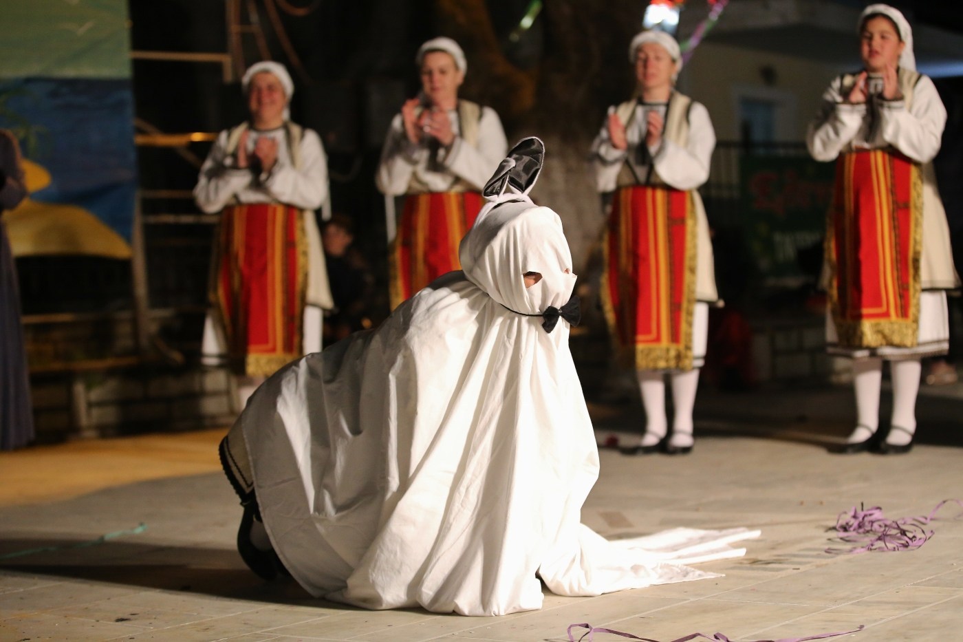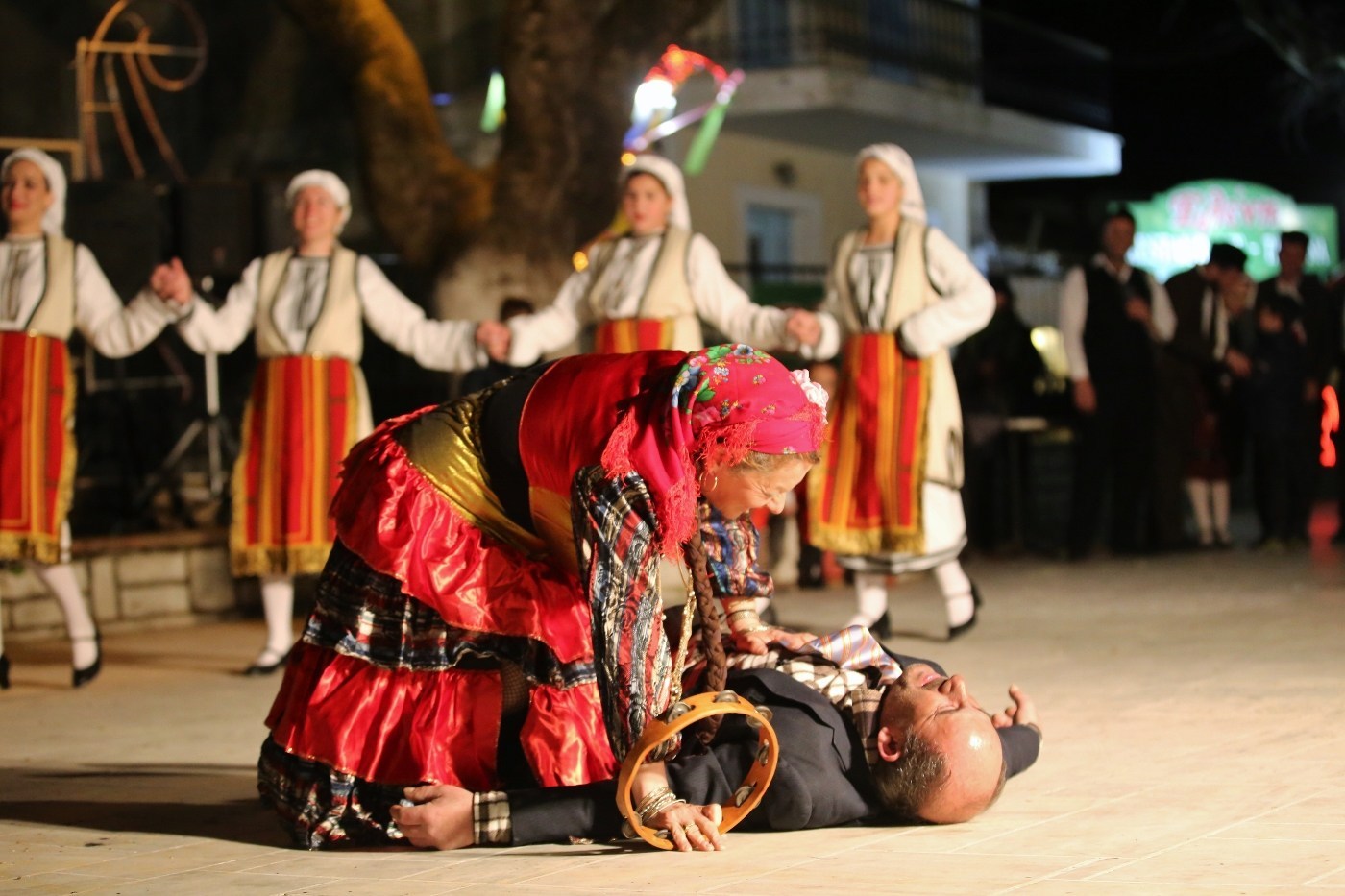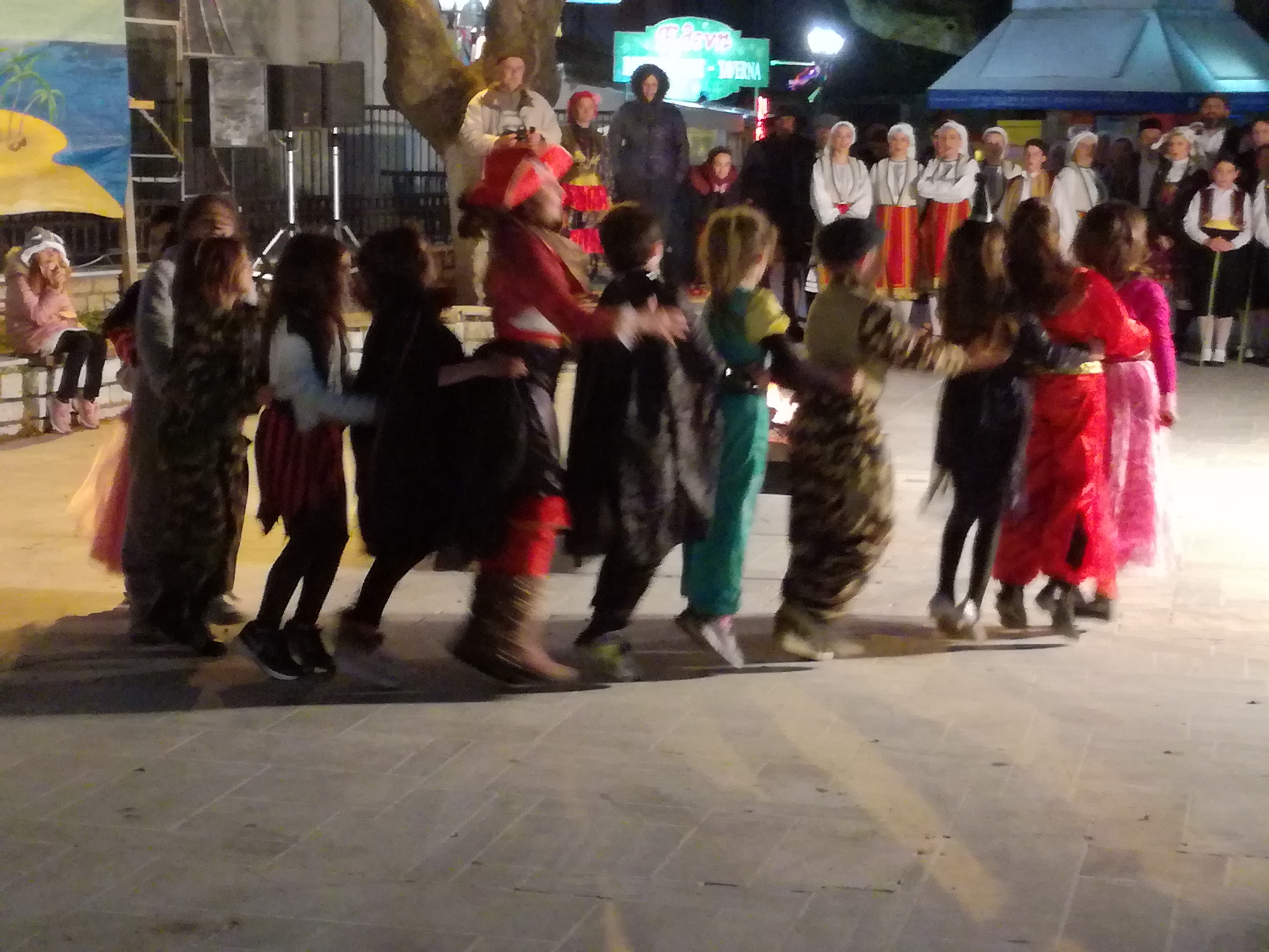 Μόλις έπεσε το σκοτάδι ανάψαν φωτιές στην πλατεία και πίσω από τον καμπαναριό του Αγίου Σπυρίδωνα ξεχύθηκαν πειρατές με βάρκες, , Μπέηδες και χανουμάκια, στολές και χρώματα Ελλάδας από τους χορευτές του Απόλλωνα και των Σκάρων της Νικιάνας.