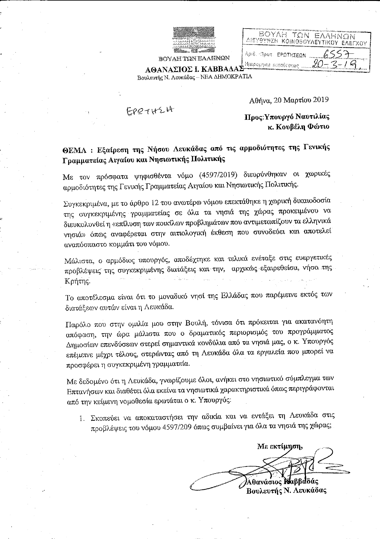 Με δεδομένο ότι η Λευκάδα, ανήκει στο νησιωτικό σύμπλεγμα των Επτανήσων και διαθέτει όλα εκείνα τα νησιωτικά χαρακτηριστικά όπως περιγράφονται από την κείμενη νομοθεσία, ο βουλευτής ερωτά των υπουργό εάν σκοπεύει να αποκαταστήσει την αδικία και να εντάξει τη Λευκάδα στις προβλέψεις του νόμου 4597/209.