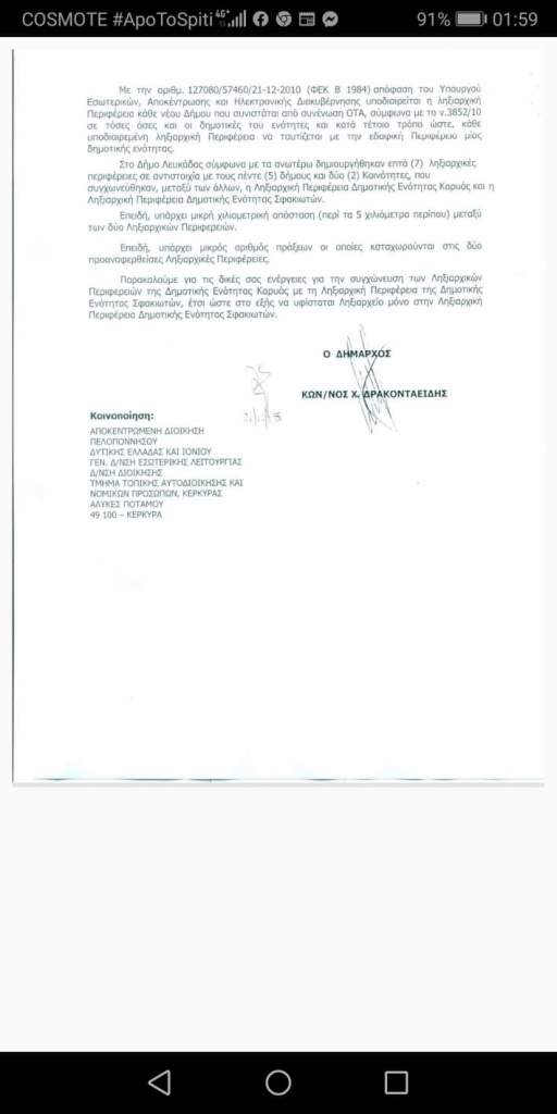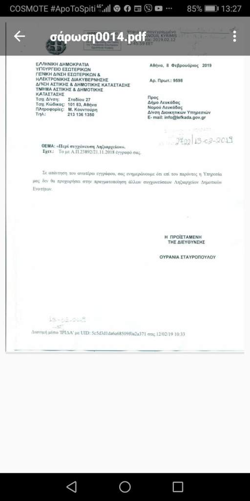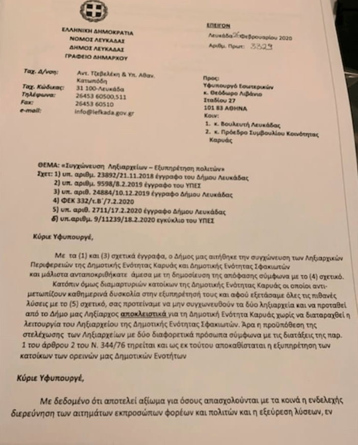 Δεν υπήρξε εντολή ή οδηγία από το υπουργείο εσωτερικών για τη συγχώνευση των δύο Ληξιαρχείων (έγγραφο υπουργείου εσωτερικών προς Δήμο Λευκάδας με ημερομηνία 8 Φεβρουαρίου 2019 – επισυνάπτεται ).