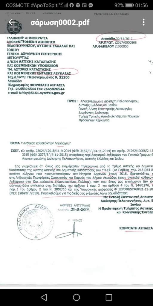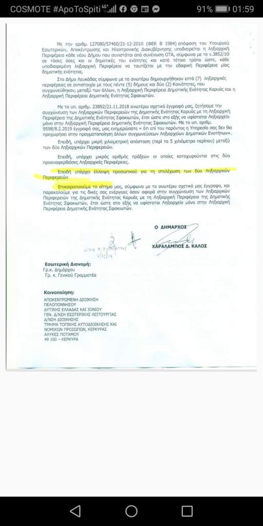 Το έγγραφο της Αποκεντρωμένης Διοίκησης με ημερομηνία 30/11/2017 προς το Δήμο διαπιστώνει ότι στις Ληξιαρχικές Περιφέρειες Σφακιωτών και Καρυάς του Δήμου Λευκάδας έχουν ανατεθεί καθήκοντα Ληξιάρχου στο ίδιο πρόσωπο,κάτι που δεν είναι σύννομο και καταλήγει:<<Παρακαλούμε για τις δικές σας ενέργειες λόγω αρμοδιότητας>>.