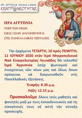 Τήν ἐρχόμενη ΤΕΤΑΡΤΗ, 10 πρός ΠΕΜΠΤΗ, 11 ΙΟΥΝΙΟΥ 2020 στόν Ἱερό Μητροπολιτικό Ναό Εὐαγγελιστρίας Λευκάδος θά τελεσθεῖ Ἱερά Ἀγρυπνία ὑπέρ φωτισμοῦ καί ἐνισχύσεως τῶν νέων μας καί ἰδίως ὅσων πρόκειται νά διαγωνισθοῦν στίς Πανελλαδικές ἐξετάσεις.