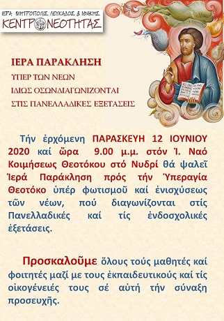 Τήν ἐρχόμενη ΠΑΡΑΣΚΕΥΗ, 12 ΙΟΥΝΙΟΥ 2020 καί ὥρα 9.00 μ.μ. στόν Ἱερό Ναό Κοιμήσεως τῆς Θεοτόκου στό Νυδρί θά τελεσθεῖ Ἱερά Παράκληση πρός τήν Ὑπεραγία Θεοτόκο ὑπέρ φωτισμοῦ καί ἐνισχύσεως τῶν νέων μας καί ἰδίως ὅσων πρόκειται νά διαγωνισθοῦν στίς Πανελλαδικές ἐξετάσεις.