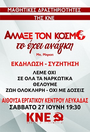 Η Οργάνωση Λευκάδας της ΚΝΕ θα πραγματοποιήσει εκδήλωση με θέμα «Λέμε ΟΧΙ σε όλα τα ναρκωτικά! Θέλουμε ζωή ολόκληρη, όχι με δόσεις!». Ομιλητής θα είναι ο Γιώργος Δαρδαμάνης, Γραμματέας του Συμβουλίου Περιοχής Ηπείρου – Κέρκυρας – Λευκάδας και μέλος του Κεντρικού Συμβουλίου της ΚΝΕ. Η εκδήλωση θα πραγματοποιηθεί στην Αίθουσα του Εργατικού Κέντρου Λευκάδας το Σαββατο 27 Ιούνη στις 19:30 και είναι ενταγμένη στις δραστηριότητες της ΚΝΕ για την 26η Ιούνη Παγκόσμια Ημέρα κατα των Ναρκωτικών.