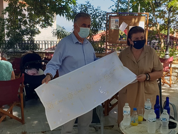 Τέλος, σε μια συμβολική κίνηση, προκειμένου να τονίσω την αξία της ένταξης του καρσάνικου κεντήματος ως πρώτου στοιχείου λευκαδίτικου πολιτισμού στον εθνικό κατάλογο άυλης πολιτιστικής κληρονομιάς, αλλά και να ευχαριστήσω την ίδια για το σύνολο της συμβολής σε θέματα πολιτισμού της Λευκάδας, προσέφερα στην Υπουργό ένα περίτεχνο Καρσάνικο κέντημα σε ανάμνηση της επίσκεψής της στην πλατεία της Καρυάς.