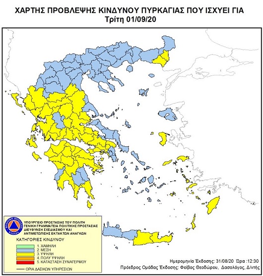 Υψηλός κίνδυνος πυρκαγιάς (κατηγορία κινδύνου 3 / κίτρινος συναγερμός) προβλέπεται για αύριο, Τρίτη 1 Σεπτεμβρίου 2020, σε ολόκληρη την επικράτεια της Περιφερειακής Ενότητας Λευκάδας, σύμφωνα με τον Ημερήσιο Χάρτη Πρόβλεψης Κινδύνου Πυρκαγιάς από τη Γενική Γραμματεία Πολιτικής Προστασίας (ΓΓΠΠ).