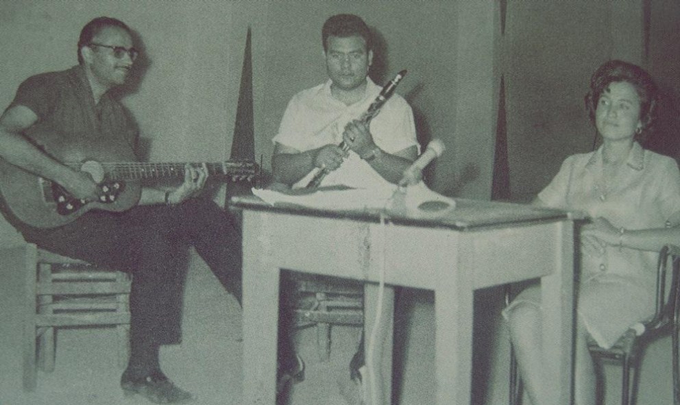 H πρώτη ηχογράφηση στην Λευκάδα, με τα πενιχρά μέσα της εποχής του 1960! Αριστερά ο Καρσάνος Μαστροσταύρος με την κιθάρα και στο κλαρίνο ο Νίκος Βρυώνης!