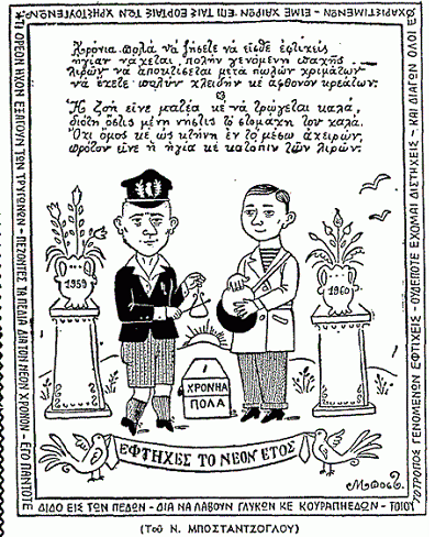 Η δεύτερη γνωριμία μου με το είδος αυτό έγινε με τα πρωτοχρονιάτικα ποιήματα, που μοίραζαν τότε οι «διανομείς» των εφημερίδων, οι «οδοκαθαρισταί», οι «φωταεριοδόται» και άλλοι ελληνοπρεπέστατοι φουκαράδες, για να πάρουν το μποναμά τους. Τι ποιήματα ήσαν εκείνα, Θεέ μου! Πέρασαν τόσα χρόνια από τότε, και οι στίχοι τους μου ξανάρχονται, κάθε τόσο, στη μνήμη μου, όπως μας ξανάρχεται στο στόμα η γεύση ενός κακομαγειρεμένου λαδερού φαγητού. Και να συλλογίζομαι τώρα ότι, πριν διαβάσω στίχους του Σολωμού, είχα διαβάσει τους στίχους του «καπνοδοχοκαθαριστού» της γειτονιάς μου, που μου ευχόταν, μουντζουρωμένος, αλά σε καθαρεύουσα, από το ύψος του καπνοδόχου, «αίσιον και ευτυχές το νέον έτος».