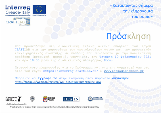 Το Επιμελητήριο Λευκάδας έχει την χαρά να σας προσκαλέσει στη διαδικτυακή τελική διεθνή εκδήλωση του έργου CRAFTLAB για την παρουσίαση των αποτελεσμάτων αυτού και των προοπτικών επιχειρηματικής ανάπτυξης σε κλάδους που συνδέονται με την πολιτιστική παράδοση (κεραμική, μωσαϊκό, υφαντική), την Τετάρτη 10 Φεβρουαρίου 2021 και ώρα 10:00 μέσω της διαδικτυακής πλατφόρμας Zoom.