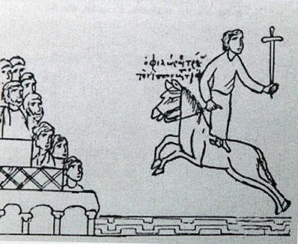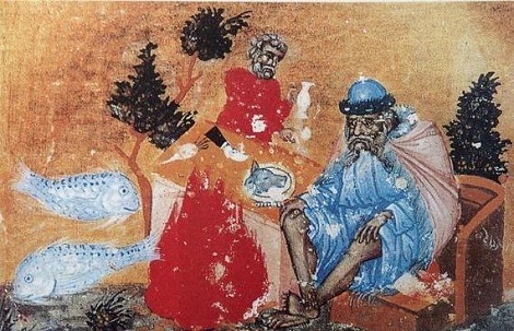 Σκωπτική Βυζαντινή μικρογραφία του 12ου αιώνα για το μήνα Φλεβάρη, που κατά κανόνα έχει τις Αποκριές στα σπλάχνα του… Ο προσωποποιημένος μήνας απολαμβάνει την φωτιά μ’ ένα καλό γεύμα, (γουρουνοκεφαλή, χορταρικά και κρασί), ενώ τον συνοδεύει η Αποκριάτικη προτροπή <<χόρταζε και πίνου>>…