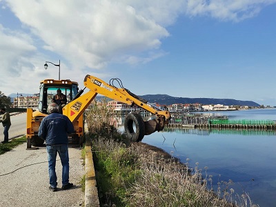 Έτσι ανέλαβαν οι εργαζόμενοι της καθαριότητας του δήμου και των ιβαριών να απομακρύνουν χειρωνακτικώς τα ογκώδη απορρίμματα στην παράκτια ζώνη της λιμνοθάλασσας, από το Πνευματικό Κέντρο έως και την ξύλινη γέφυρα, την Τρίτη 9/3/21. Σήμερα Τετάρτη 10/3/21, οι εργασίες καθαρισμού θα συνεχιστούν από τη Μαρίνα έως και τον Πόντε, όπου είναι εφικτό, με την χρήση μηχανικών μέσων.