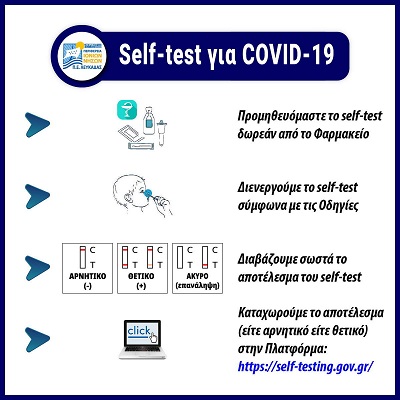 Δείτε το βίντεο του ΕΟΔΥ με τις Οδηγίες για τη διενέργεια self-test στο σύνδεσμο: https://www.youtube.com/watch?v=XrZikXKskyQ&list=PL_2mPNUW8A76YjYq6TUQsrJtlAXjwiHhi