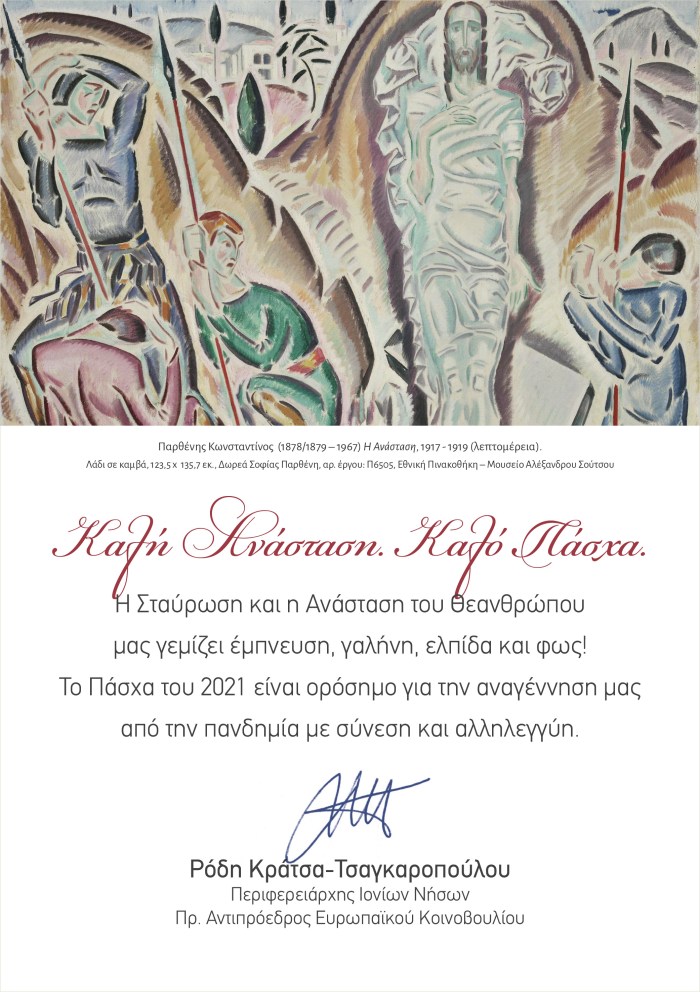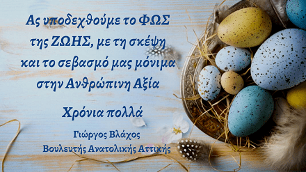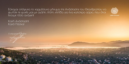 Το Ανέσπερο Φως της Ανάστασης του Χριστού ας πλημμυρίσει τις καρδιές μας και ας μας δίνει δύναμη, ώστε να ανταποκρινόμαστε σε κάθε πρόκληση, μικρή ή μεγάλη, προσωπική ή συλλογική, με αλληλεγγύη και αισιοδοξία.
