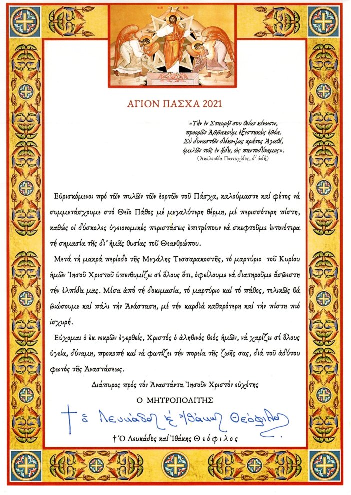 Πασχάλιες Ευχές Σεβασμιωτάτου Μητροπολίτου Λευκάδος και Ιθάκης κ. Θεοφίλου.
