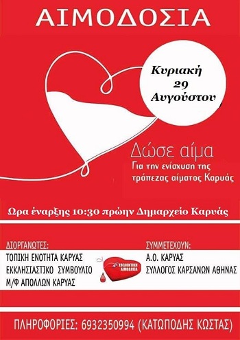 Την Κυριακή 29 Αυγούστου 2021 θα γίνει εθελοντική αιμοδοσία στο πρώην Δημαρχείο Καρυάς ,ώρα έναρξης 10.30