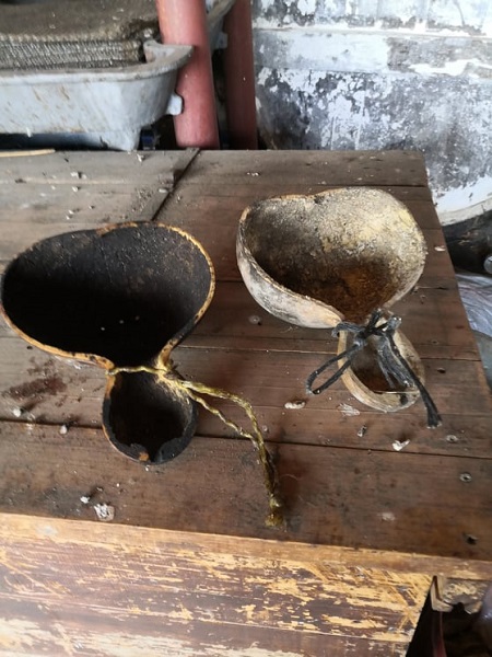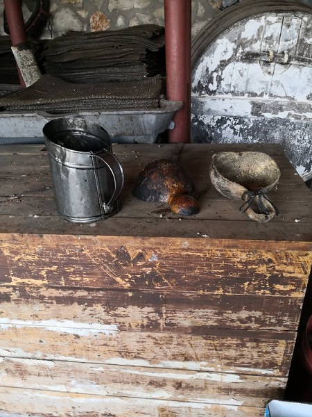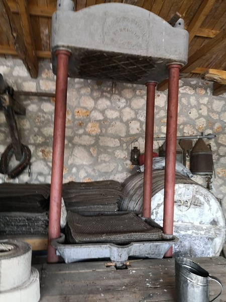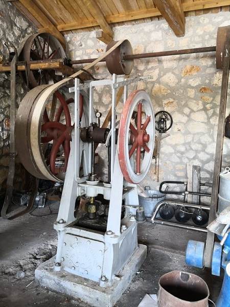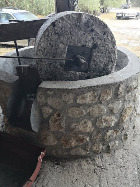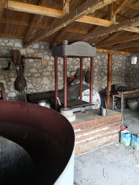 Αλεστική (αλώνι) γύρω από την οποία γύριζε το άλογο με τον αγωγιάτη του, τα ζυγόσκοινα,η λαιμαριά του αλόγου,τα λιθάρια,τα τσόλια,η μηχανή (πιεστήριο) , η πλάντρα,η βίδα, το ξύλινο σκαφίδι χωρισμένο σε δύο διαμερίσματα.