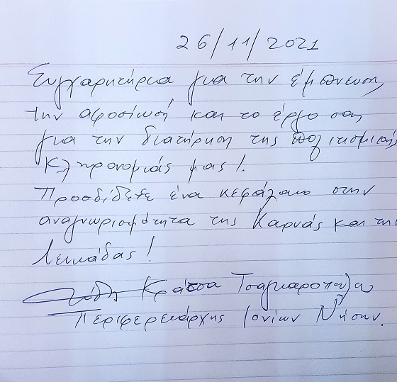 Το Διοικητικό Συμβούλιο του Μ/Ο «Ο Απόλλων» Καρυάς ευχαριστεί την Περιφερειάρχη για την επίσκεψη της.