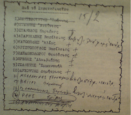 Η φωτογραφία είναι από τη δίκη των 11 φοιτητών που είχαν συλληφθεί στο Πολυτεχνείο στις 14 Φεβρουαρίου 1973. Διακρίνονται από αριστερά στην πρώτη σειρά οι: Παρασκευάς Βάγιας, Σεραφείμ Δημακόπουλος, Μάκης Μπαλαούρας, Κυριάκος Σταμέλος. Στη δεύτερη σειρά από αριστερά οι: Βλάσης Λιαροκάπης, Ηλίας Κατωπόδης, Βασίλης Χριστόπουλος, Σάκης Παπαθεοδώρου. Στην τρίτη σειρά από αριστερά οι: Άλκης Πρέπης, Μάνος Τζανετής και Δημήτρης Αρχοντής.