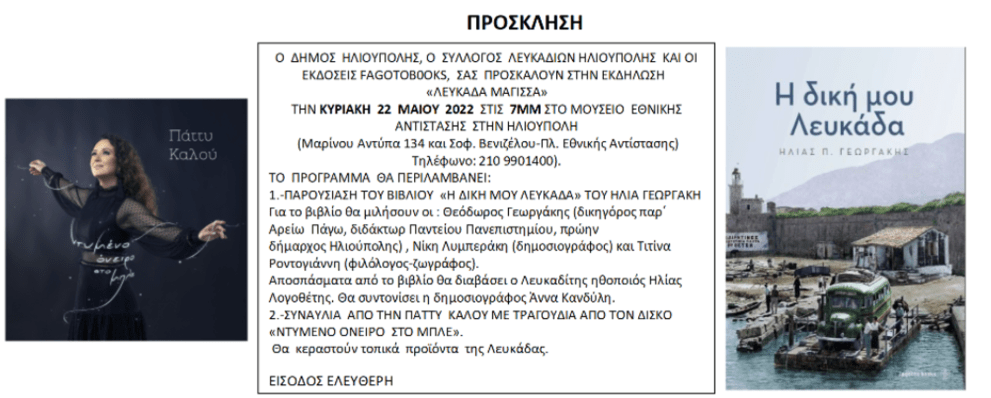 Εκδήλωση με τίτλο ‘Λευκάδα Μάγισσα’ οργανώνει ο Δημος Ηλιούπολης και ο Σύλλογος Λευκαδίων Ηλιούπολης, την Κυριακή 22 Μαίου 2022 στις 7μμ ΣΤΟ ΜΟΥΣΕΙΟ ΕΘΝΙΚΗΣ ΑΝΤΙΣΤΑΣΗΣ ΣΤΗΝ ΗΛΙΟΥΠΟΛΗ (Μαρίνου Αντύπα 134 και Σοφ. Βενιζέλου-Πλ. Εθνικής Αντίστασης)-τηλέφωνο: 210 9901400).