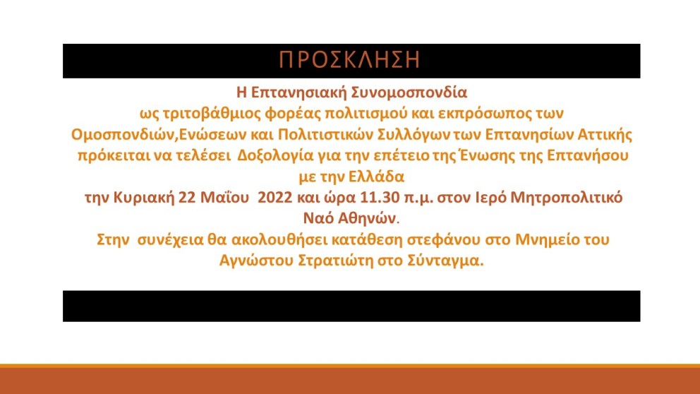 Προσκλήσεις για τις εκδηλώσεις που θα γίνουν το Σάββατο 21/5 και την Κυριακή 22/5 για τον Εορτασμό της Επετείου της Ένωσης της Επτανήσου με την Ελλάδα.