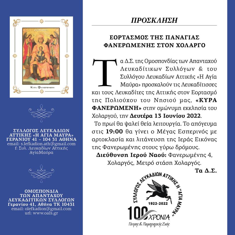 Την Δευτέρα 13/6/2022, Γιορτή του Αγίου Πνεύματος, το Νησί μας και οι Απανταχού Λευκαδίτες και Λευκαδίτισσες γιορτάζουν την Προστάτιδα του Νησιού μας «Κυρά Φανερωμένη». Η Ομοσπονδία των Απανταχού Λευκαδίτικων Συλλόγων και ο Σύλλογος Λευκαδίων Αττικής «Η Αγία Μαύρα» όπως κάθε χρόνο την ημέρα αυτή, γιορτάζουν με λαμπρότητα την Μεγάλη αυτή Εορτή με τους Λευκαδίτες της Αττικής. Έτσι και φέτος θα γιορτάσουν την Πολιούχο του Νησιού μας στην ομώνυμη εκκλησία του Χολαργού και σας καλούμε να παρευρεθείτε.
