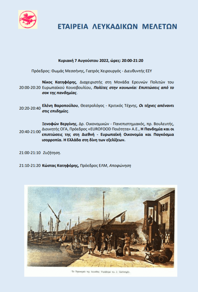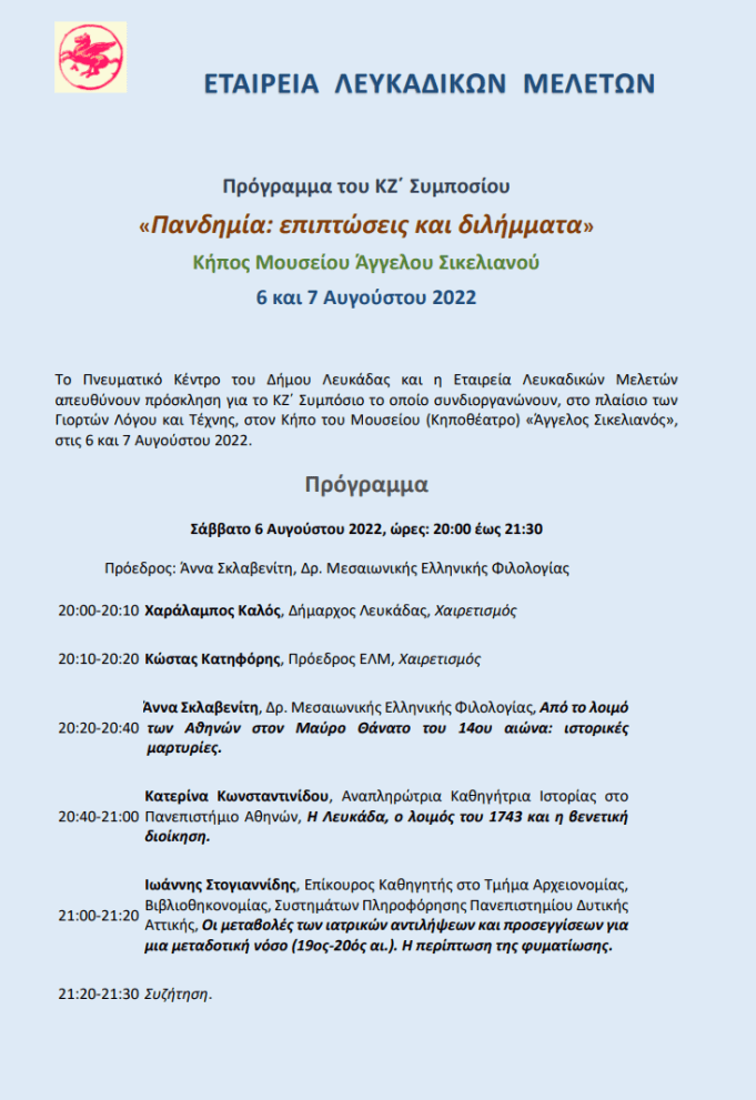 Το Πνευματικό Κέντρο του Δήμου Λευκάδας και η Εταιρεία Λευκαδικών Μελετών συνδιοργανώνουν και σας προσκαλούν να τιμήσετε με την παρουσία σας το ΚΖ΄ Συμπόσιο, με θέμα «Πανδημία: επιπτώσεις και διλήμματα», το οποίο διεξάγεται στο πλαίσιο των Γιορτών Λόγου και Τέχνης, στον Κήπο του Μουσείου (‘Κηποθέατρο’) Άγγελου Σικελιανού, το Σάββατο 6 και την Κυριακή 7 Αυγούστου 2022.
