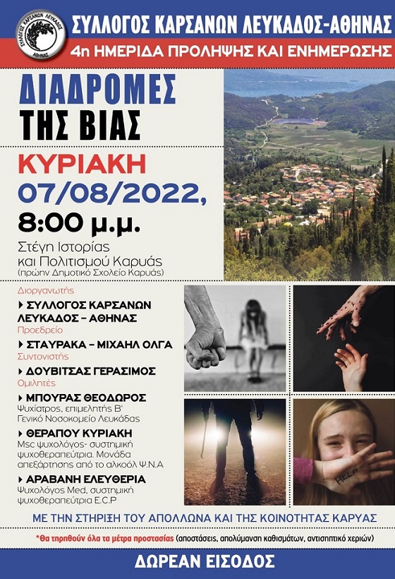 Ο Σύλλογος Καρσάνων Λευκάδος-Αθήνας συνεχίζοντας εδω και 4 χρόνια την διοργάνωση Ημερίδων Πρόληψης και Ενημέρωσης στη Καρυά διοργανώνει στις 7 Αυγούστου 2022 την 4η Ημερίδα με θέμα : » ΔΙΑΔΡΟΜΕΣ ΤΗΣ ΒΙΑΣ »