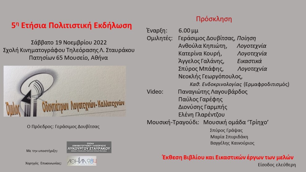 Σας καλούμε και σας περιμένουμε στην 5 η Πολιτιστική Εκδήλωση του Ομίλου μας που θα γίνει το Σάββατο 19 Νοεμβρίου 2022 στην Σχολή Κινηματογράφου Τηλεόρασης Λ. Σταυράκου Πατησίων 65 Μουσείο, Αθήνα