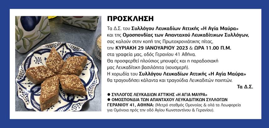Τα Δ.Σ. της Ομοσπονδίας των Απανταχού Λευκαδίτικων Συλλόγων & του Συλλόγου Λευκαδίων Αττικής «Η Αγία Μαύρα» σας προσκαλούν στην κοπή της Πρωτοχρονιάτικης Πίτας την Κυριακή 29/1/2023.