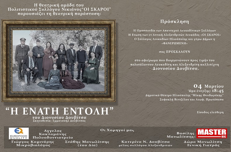Τη θεατρική παράσταση παρουσιάζει η θεατρική ομάδα του Πολιτιστικού Συλλόγου Νικιάνας «Οι Σκάροι»