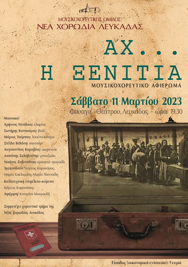 Ο Μουσικοχορευτικός Όμιλος «Νέα Χορωδία Λευκάδας» διοργανώνει μουσική εκδήλωση αφιερωμένη στην ξενιτιά με τίτλο: