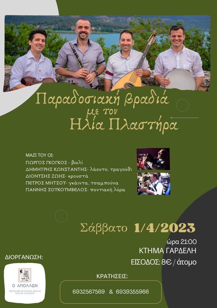 Ο Μουσικοφιλολογικός Όμιλος Καρυάς Λευκάδας ¨Ο ΑΠΟΛΛΩΝ» διοργανώνει παραδοσιακή βραδιά με την ορχήστρα του δεξιοτέχνης του κλαρίνου Ηλία Πλαστήρα σε ένα μουσικοχορευτικό ταξίδι σε όλη την Ελλάδα.