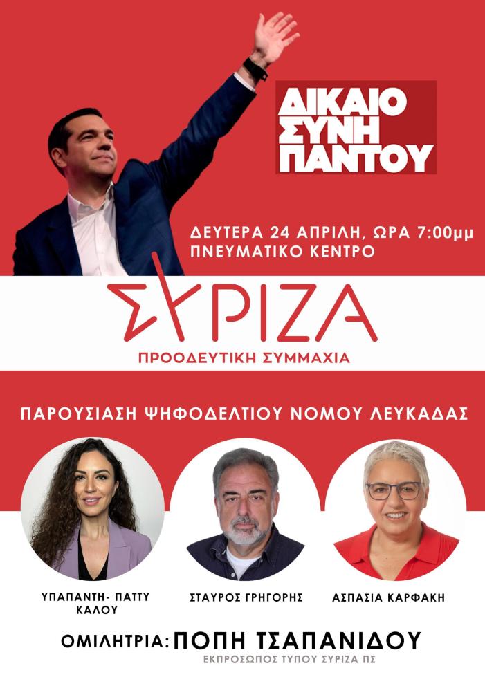 Η Πόπη Τσαπανίδου θα είναι κεντρικός ομιλητής στην παρουσίαση του ψηφοδελτίου του ΣΥΡΙΖΑ- ΠΣ στην Λευκάδα που θα γίνει την Δευτέρα 24 Απριλίου στις 7.00 το απόγευμα στο Πνευματικό Κέντρο.