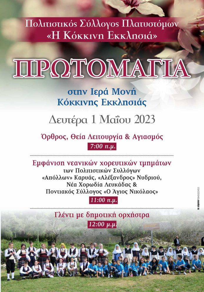 Ο Πολιτιστικός Σύλλογος Πλατυστόμων «Η Κόκκινη Εκκλησιά» σας προσκαλεί στην πρωτομαγιάτικη εορταστική εκδήλωση που διοργανώνει στην Ιερά Μονή Κόκκινης Εκκλησιάς την Δευτέρα 1 Μαΐου 2023.