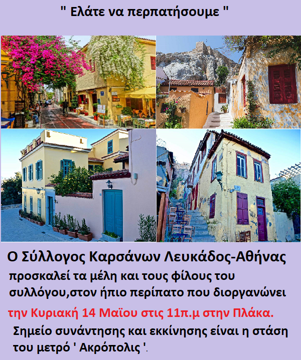Ο Σύλλογος Καρσάνων Λευκάδος-Αθήνας προσκαλεί τα μέλη και τους φίλους του συλλόγου,στον ήπιο περίπατο που διοργανώνει την Κυριακή 14 Μαϊου στις 11π.μ στην Πλάκα.