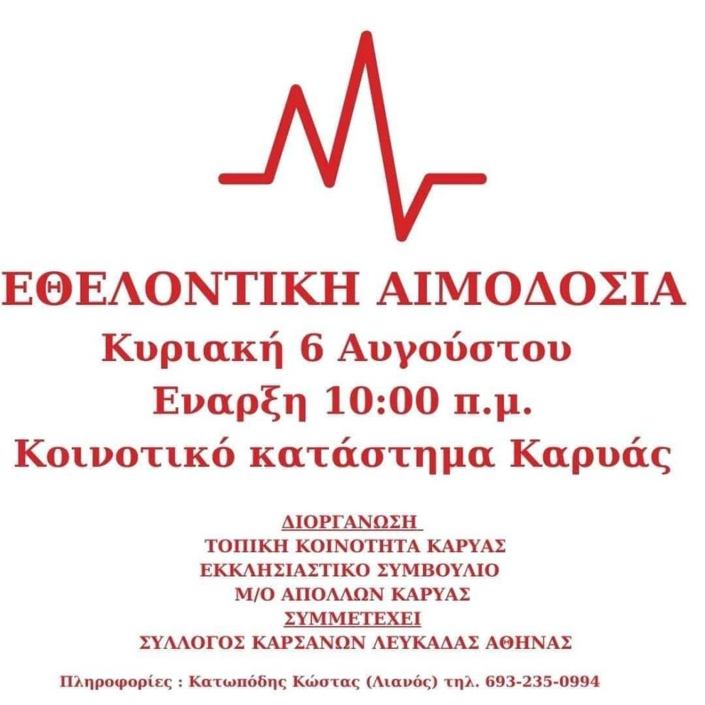 Ο Σύλλογος Καρσάνων Λευκάδος-Αθήνας καλεί τα μέλη του και τους φίλους του συλλόγου να συμμετάσχουν ενεργά στην ΕΘΕΛΟΝΤΙΚΗ ΑΙΜΟΔΟΣΙΑ που θα γίνει την Κυριακή 6 Αυγούστου στο Κοινοτικό κατάστημα Καρυάς.