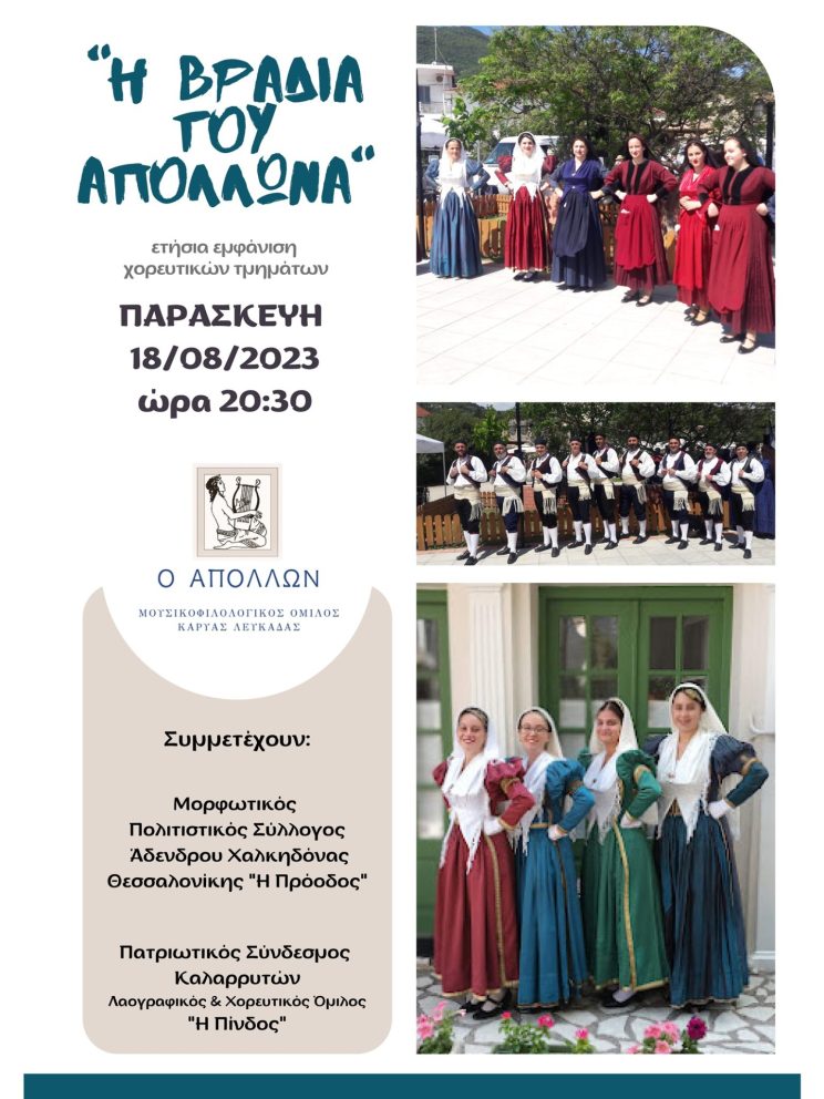 Την ετήσια εμφάνιση των χορευτικών του τμημάτων διοργανώνει την Παρασκευή 18 Αυγούστου στις 20:30 ο Μουσικοχορευτικός Όμιλος Καρυάς Λευκάδας «ο Απόλλων»