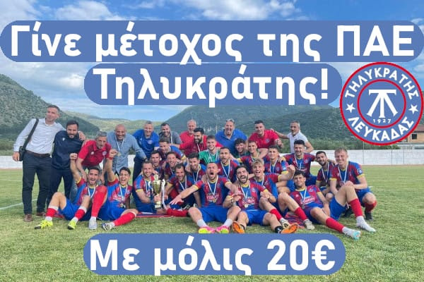| Αγαπητοί φίλοι του Τηλυκράτη, έφτασε η ώρα, που πρέπει όλοι να συνδράμουμε στην προσπάθεια οικονομικής ενίσχυσης της νεοσύστατης ΠΑΕ ΤΗΛΥΚΡΑΤΗΣ, προκειμένου να εξασφαλίσει το Μετοχικό Κεφάλαιο των 350.000 ευρώ, που απαιτείται για να ανταπεξέλθει στην πρόκληση της συμμετοχής στο επαγγελματικό πρωτάθλημα της superleague 2. Κάνουμε έκκληση στους πραγματικούς φίλους της ομάδας, να βοηθήσουν με την αγορά έστω και λίγων μετοχών, καθώς το αργότερο μέσα στο επόμενο 7ήμερο, πρέπει να συμπληρωθεί ολόκληρο το ποσό των 350.000 ευρώ. Το διαχρονικό όνειρο της ανόδου του Τηλυκράτη στην Β΄ Εθνική, για να λάβει σάρκα και οστά, απαιτείται η μαζική συμμετοχή των χιλιάδων ανώνυμων φίλων της ομάδας σε όλη τη χώρα και κυρίως των Λευκαδίων του εξωτερικού που με κάθε τρόπο έχουν στο παρελθόν εκφράσει την αγάπη τους στον σύλλογο. Το μήνυμα πρέπει να φτάσει σε κάθε γωνιά του πλανήτη, σε όλους τους Λευκαδίτες που έχουν την δυνατότητα και την θέληση, να βοηθήσουν τον ιστορικότερο σύλλογο του νησιού μας. Η αξία κάθε μετοχής ορίσθηκε στα 20 ευρώ και μπορεί όποιος επιθυμεί να τις προμηθευτεί, με κατάθεση στον λογαριασμό της ΠΑΕ στην ALPHA BANK GR6301406840684002002021357 – BIC: CRBAGRAA Απαραίτητα όποιος μεταφέρει χρήματα στον λογαριασμό, πρέπει να αναγράφει επίθετο και ΑΦΜ, προκειμένου να εντοπισθεί, για να λάβει τους οριστικούς τίτλους των μετοχών του, όταν συμπληρωθεί εξ’ ολοκλήρου το Μετοχικό Κεφάλαιο. Για εναλλακτικούς τρόπους αγοράς μετοχών μπορείτε να ενημερωθείτε στο 2645023759 πρωινές ώρες ή στο 698 2163760 (κος. Φραγκούλης Σπύρος). Από την Διοικούσα Επιτροπή του ΤΗΛΥΚΡΑΤΗ |