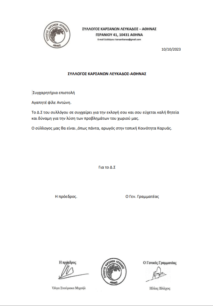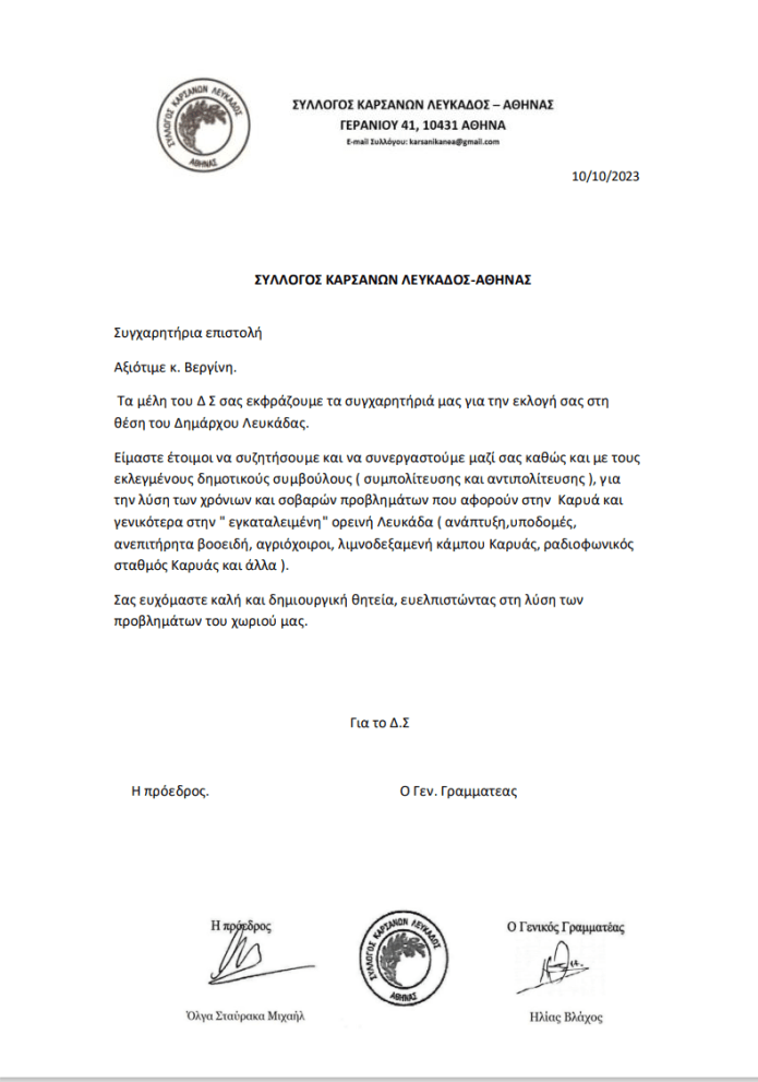 Τα μέλη του Δ Σ σας εκφράζουμε τα συγχαρητήριά μας για την εκλογή σας στη θέση του Δημάρχου Λευκάδας.