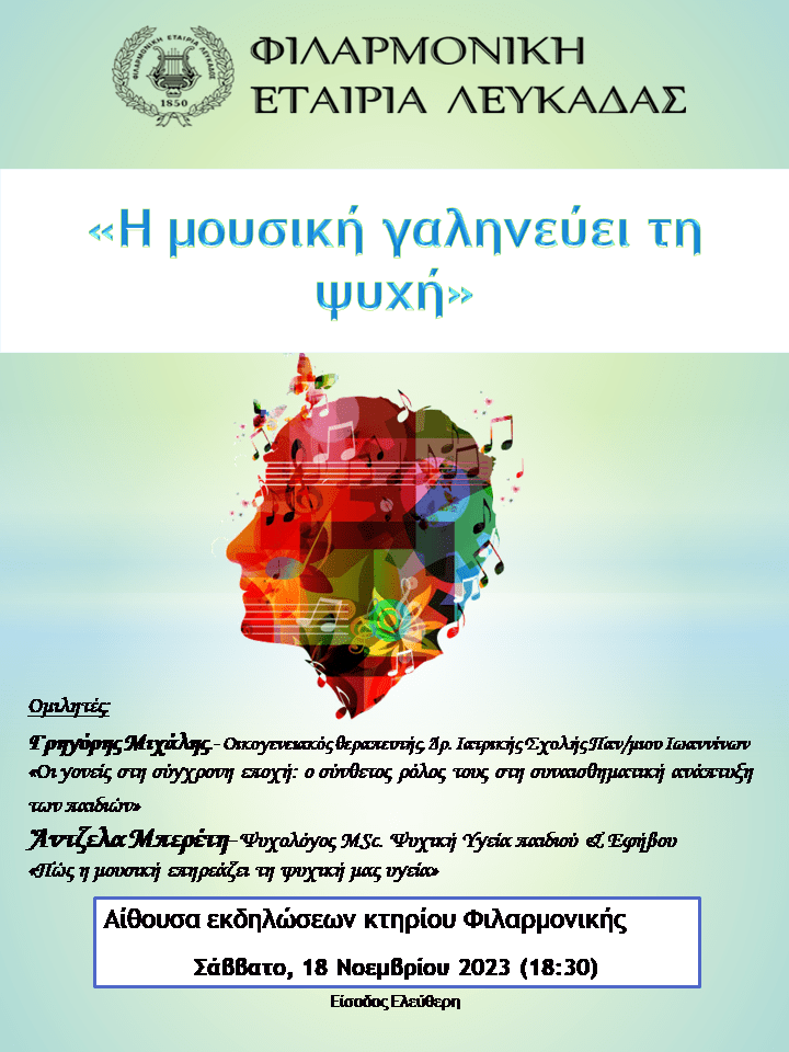 Η Φιλαρμονική Εταιρία Λευκάδας διοργανώνει το Σάββατο 18 Νοεμβρίου, στις 18:30, στην Αίθουσα εκδηλώσεων του κτηρίου της, εκδήλωση με θέμα «Η μουσική γαληνεύει την ψυχή».