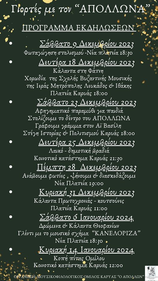 Το πρόγραμμα των Χριστουγεννιάτικων εκδηλώσεων από τον Απόλλωνα Καρυάς Γιορτές με τον «Απόλλωνα» στην Καρυά. Καλές γιορτές σε όλους!!!! Κοινοποιήστε: Μοιραστείτε στο X(Ανοίγει σε νέο παράθυρο) Χ Mοιραστείτε στο Facebook(Ανοίγει σε νέο παράθυρο) Facebook Εκτύπωση(Ανοίγει σε νέο παράθυρο) Εκτύπωση Στείλε ένα σύνδεσμο σε έναν φίλο(Ανοίγει σε νέο παράθυρο) Email Μου αρέσει! Φόρτωση... Δημοσιεύθηκε από i.vl Δείτε όλα τα άρθρα του/της i.vl