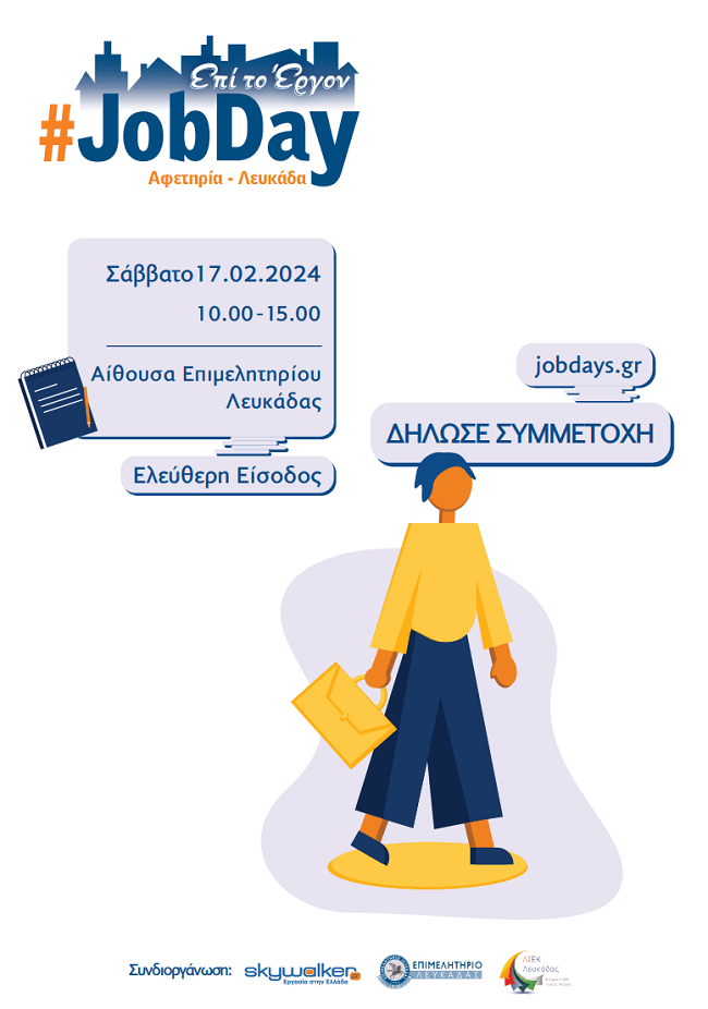 ToΕπιμελητήριο Λευκάδας σε συνεργασίαμε τοskywalker.gr – Εργασία στην Ελλάδακαι το Δημόσιο ΣΑΕΚ Λευκάδας (πρώην ΔΙΕΚ),διοργανώνει το#JobDay Αφετηρία – Λευκάδα τοΣάββατο 17 Φεβρουαρίου2024από τις10:00 έως τις 15:00στη συνεδριακή αίθουσα του Επιμελητηρίου Λευκάδας.
