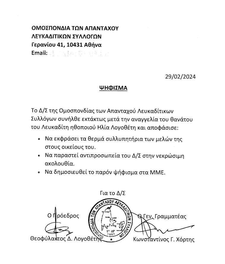 εκφράζουμε την βαθύτατη θλίψη μας για την απώλεια του σπουδαίου Λευκαδίτη Ηλία