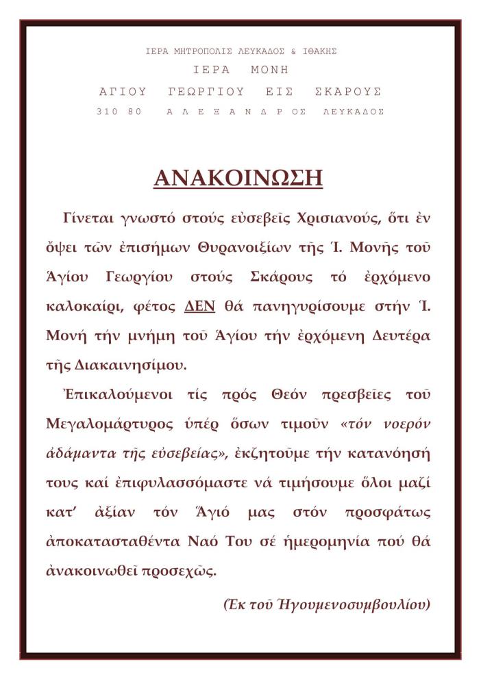 Δεν θα πανηγυρίσει φέτος τη Δευτέρα του Πάσχα η Ι. Μονής Αγίου Γεωργίου στους Σκάρους Κοινοποιήστε: Μοιραστείτε στο X(Ανοίγει σε νέο παράθυρο) Χ Mοιραστείτε στο Facebook(Ανοίγει σε νέο παράθυρο) Facebook Εκτύπωση(Ανοίγει σε νέο παράθυρο) Εκτύπωση Στείλε ένα σύνδεσμο σε έναν φίλο(Ανοίγει σε νέο παράθυρο) Email Μου αρέσει! Φόρτωση... Δημοσιεύθηκε από i.vl Δείτε όλα τα άρθρα του/της i.vl