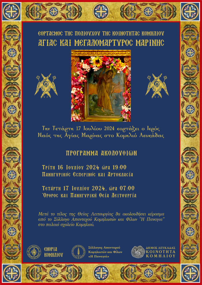 Την Τετάρτη 17 Ιουλίου εορτάζει ο Ιερός Ναός της Αγίας Μαρίνας στο Κομηλιό Λευκάδας.