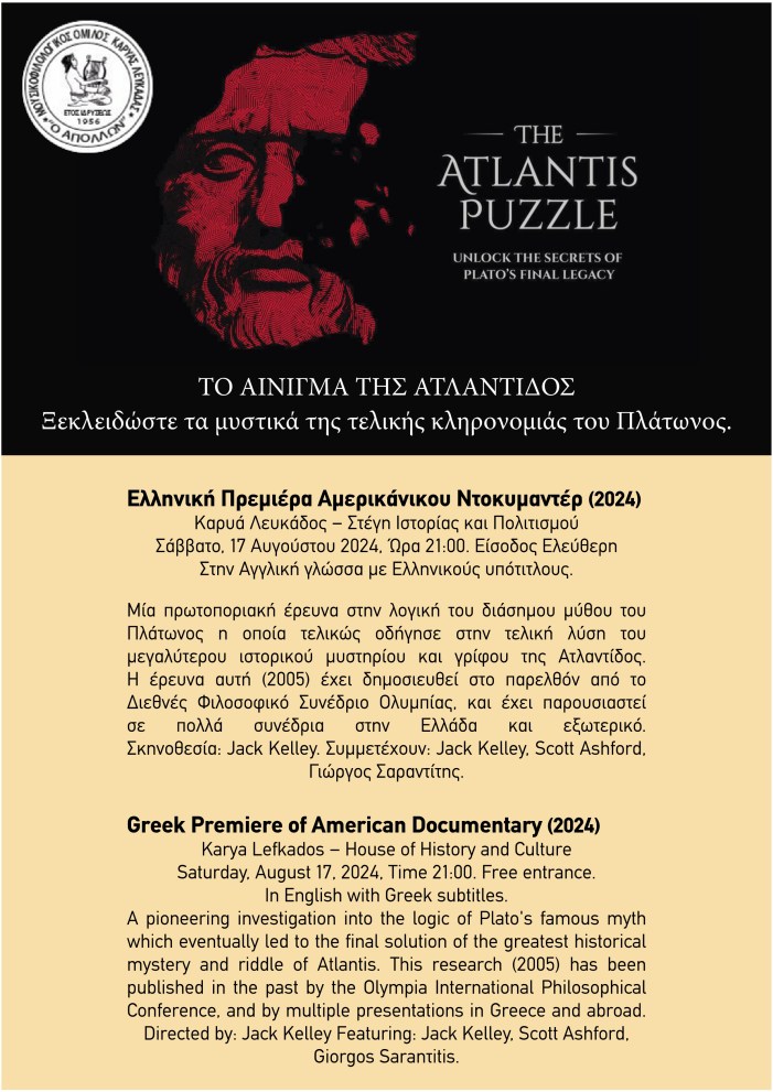 Ο Μουσικοφιλολογικός Όμιλος Καρυάς Λευκάδας «ο Απόλλων» παρουσιάζει το Σάββατο 17 Αυγούστου, στις 21:00, στη Στέγη Ιστορίας και Πολιτισμού Καρυάς, το ντοκιμαντέρ «Το αίνιγμα της Ατλαντίδος». THE ATLANTIS PUZZLE