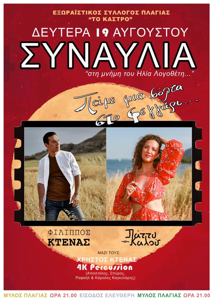 Ο Πολιτιστικός Εξωραϊστικός Σύλλογος Πλαγιάς «Το Κάστρο» διοργανώνει τη Δευτέρα 19 Αυγούστου 2024, στις 21:00, στον Μύλο Πλαγιάς, συναυλία με ελεύθερη είσοδο με τους Φίλιππο Κτενά και Πάττυ Καλού, με τίτλο «Πάμε μια βόλτα στο φεγγάρι».