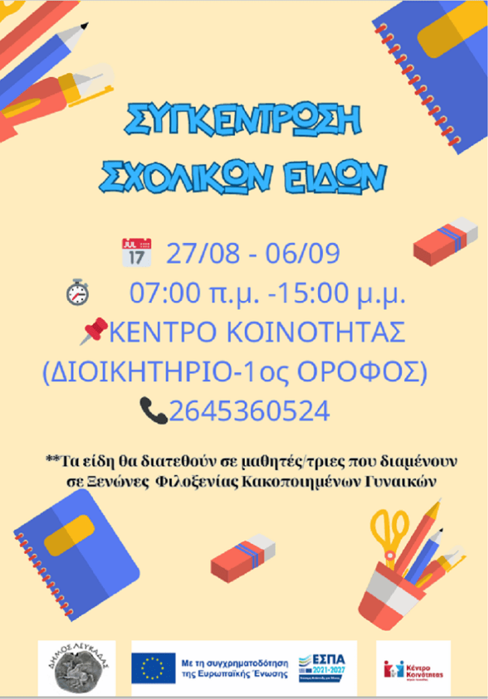 Το Κέντρο Κοινότητας του Δήμου Λευκάδας πρόκειται να συγκεντρώσει σχολικά είδη (π.χ. σχολικές τσάντες, κασετίνες, τετράδια, γραφική ύλη κ.α.), καινούρια ή μεταχειρισμένα –σε καλή κατάσταση– με σκοπό να διατεθούν σε μαθητές/-τριες που διαμένουν σε Ξενώνες Φιλοξενίας Κακοποιημένων Γυναικών.